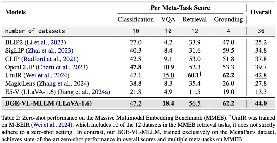 BGE-VL achieve state-of-the-art performance on four popular zero-shot composed image retrieval benchmarks and the massive multimodal embedding benchmark (MMEB). Extensive experiments demonstrate the efficiency, scalability, and generalization features of MegaPairs. Please refer to our paper for more details.