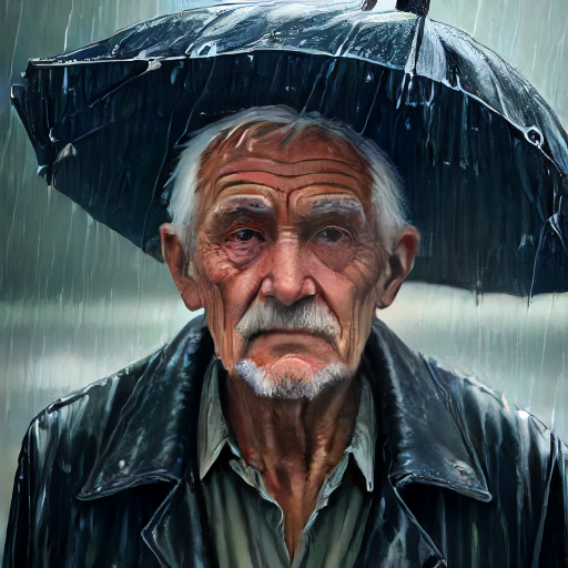 prompt = "a close-up picture of an old man standing in the rain"