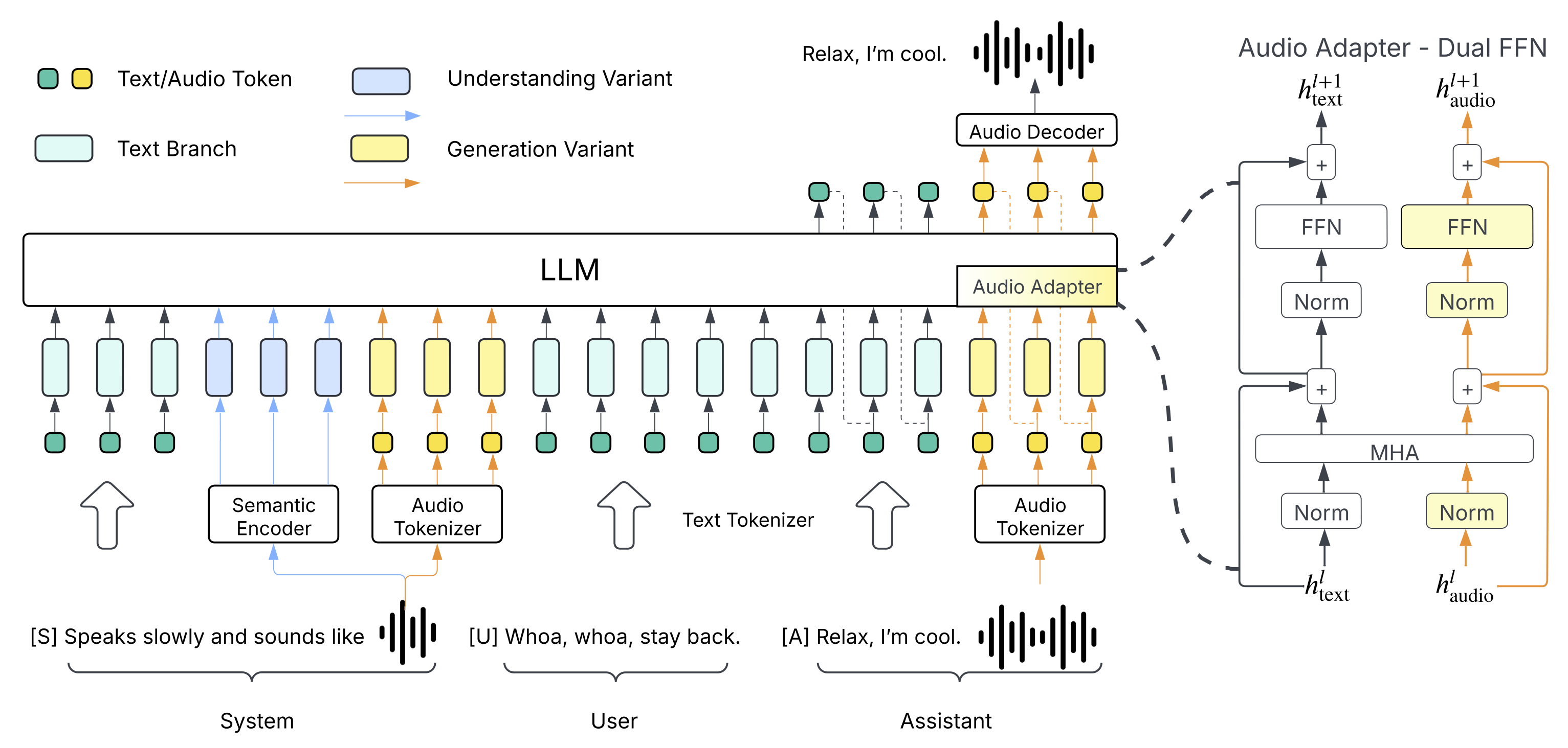 - We proposed the DualFFN architecture, which enhances the LLM’s ability to model acoustics tokens with minimal computational overhead.