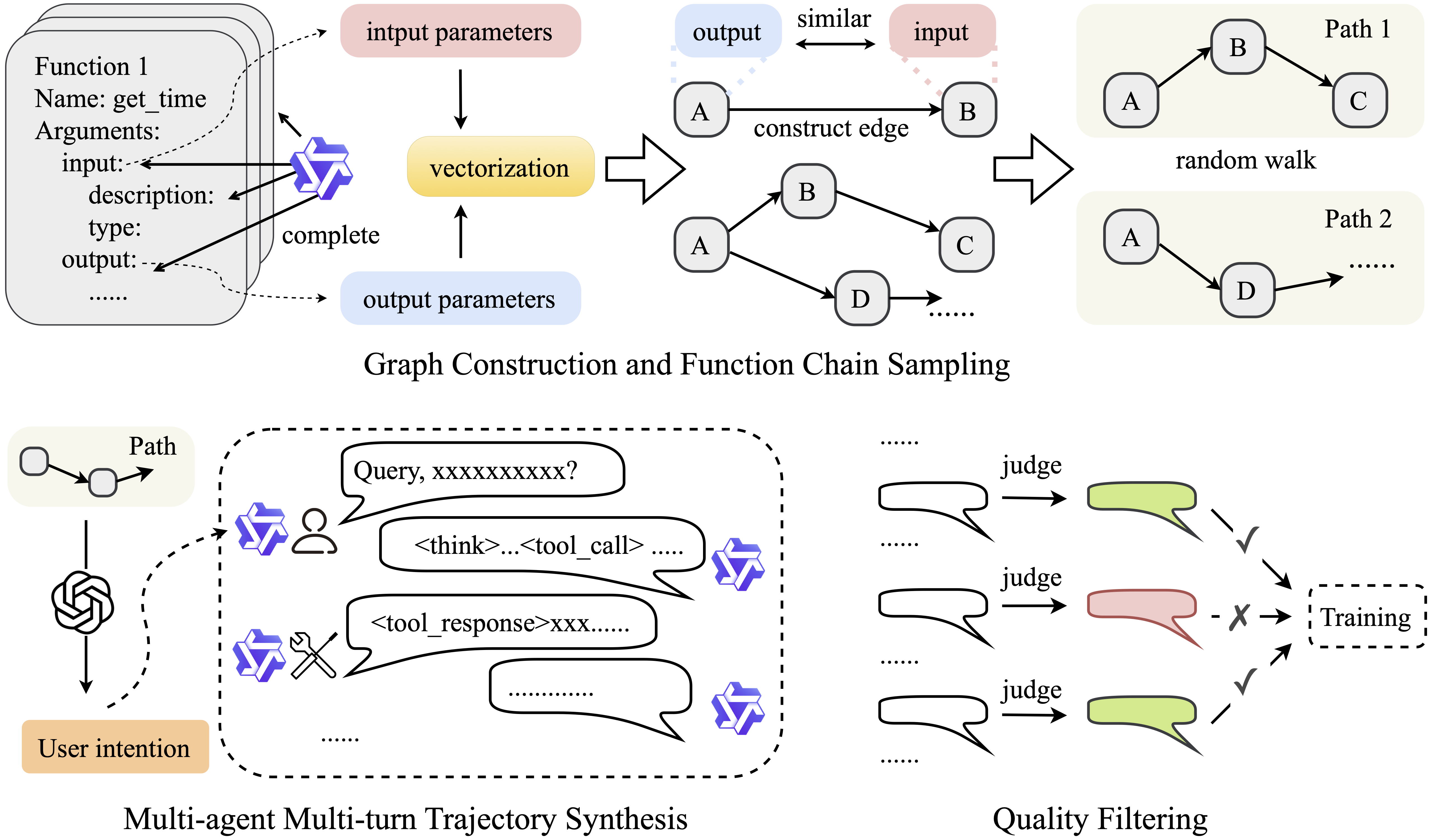 - We construct a directed graph over the collected functions to model their input–output compatibility, and then sample function chains via random walks for trajectory synthesis.
