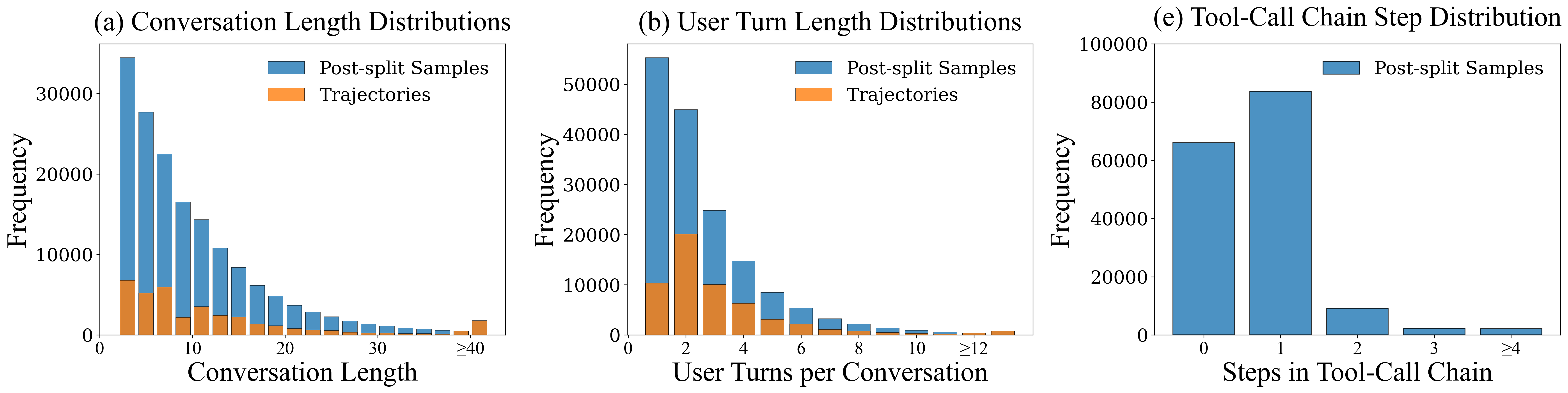 - We split each trajectory into multiple samples using the turns that passed the turn-level quality filter and analyze both trajectories (orange) and post-split samples (blue).