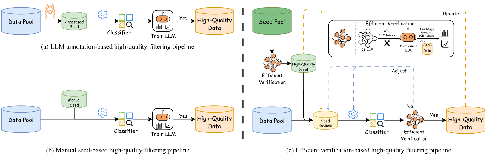 - Efficient Verification Strategy: We propose a computationally efficient verification strategy that enables rapid evaluation of the impact of data on LLM training performance with minimal computational cost, significantly improving the efficiency of high-quality data filtering experiments.